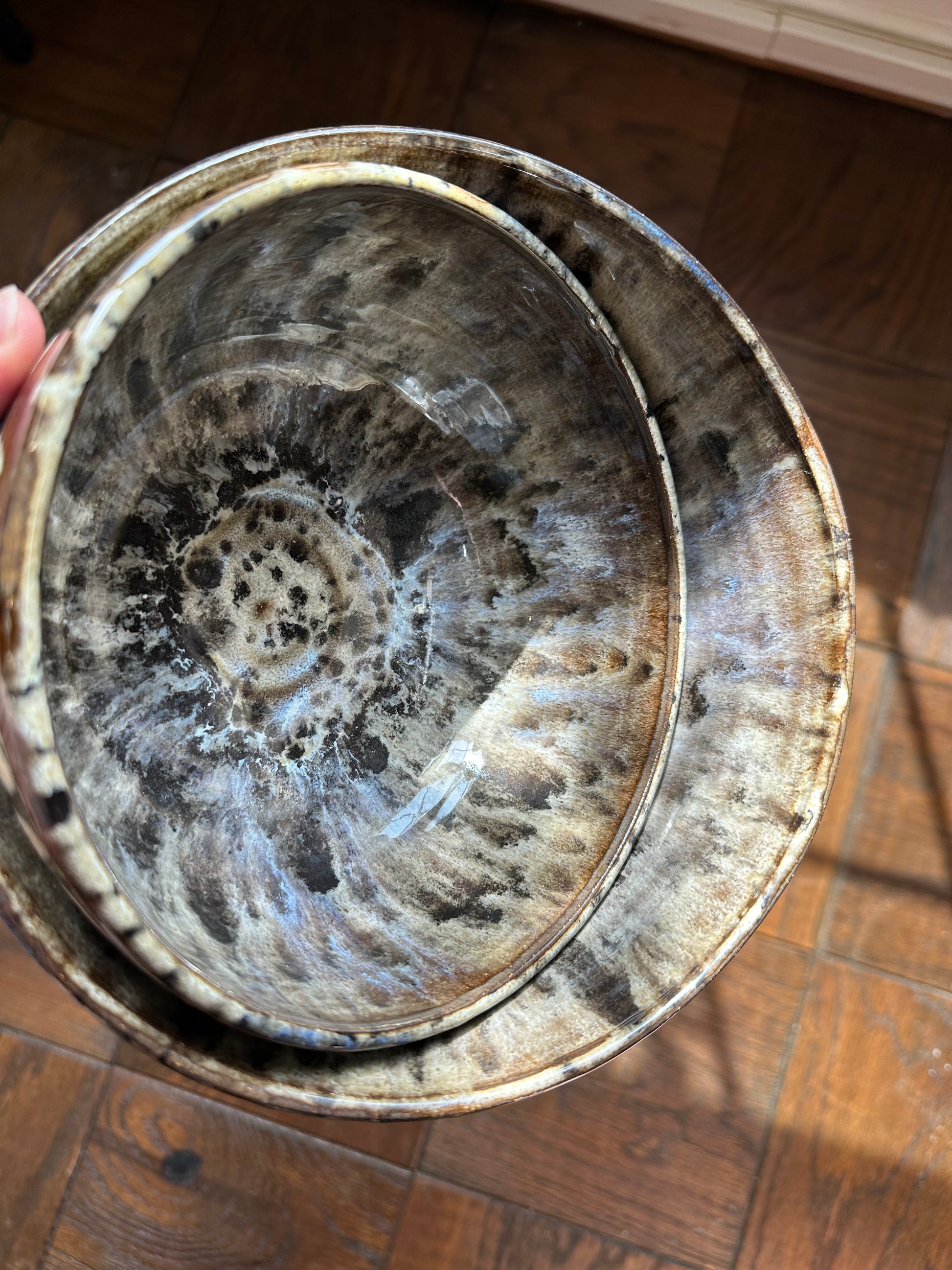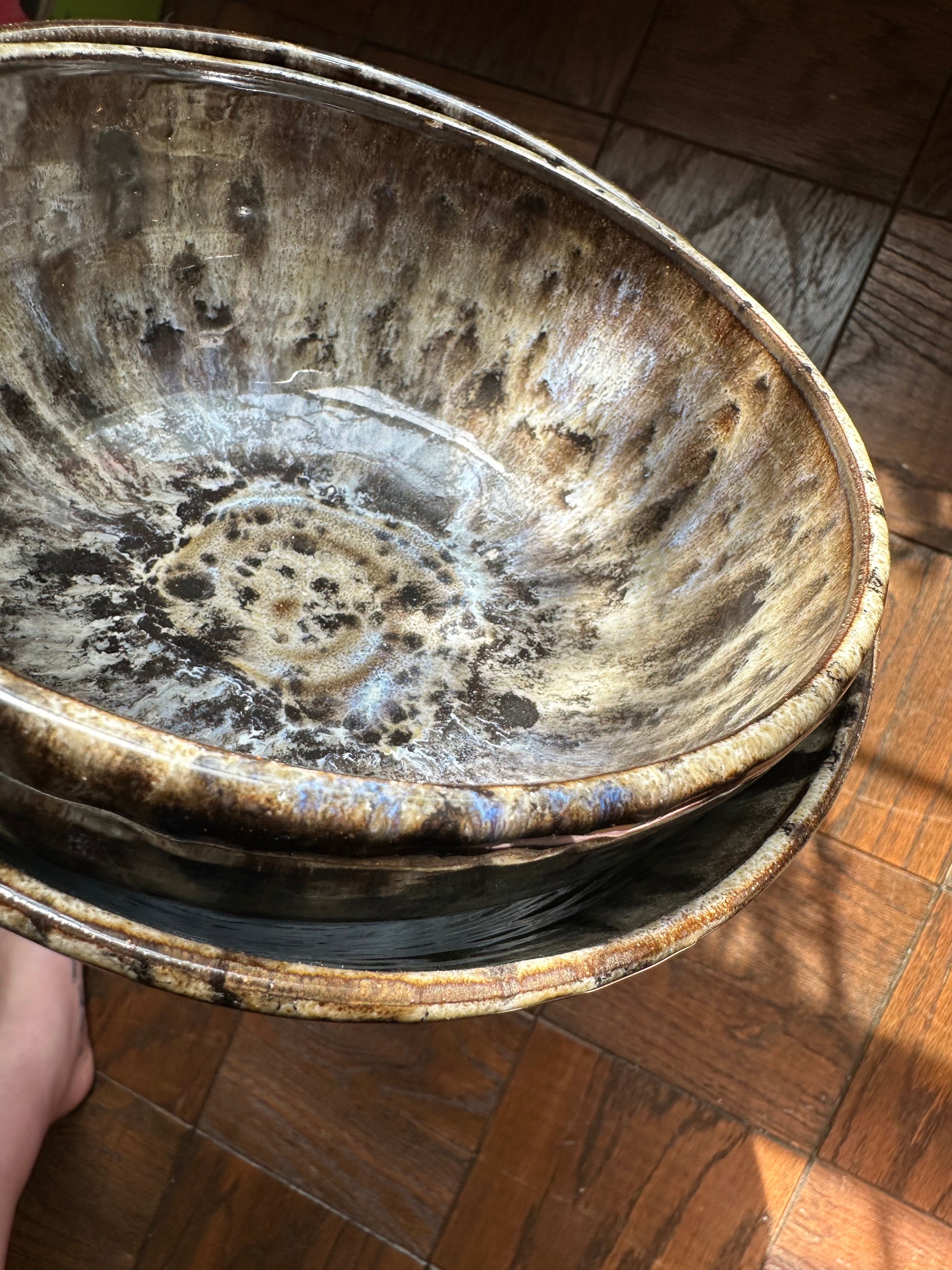 These two stacking bowls are the crème de la crème! Their spotted interior evokes Dalmatian spots, but rich, creamy, and fancy. Cookies and cream, but make it in a set of serving bowls? Got it! They need a home that will LOVE them where they can be displayed or served at lovely dinner parties!