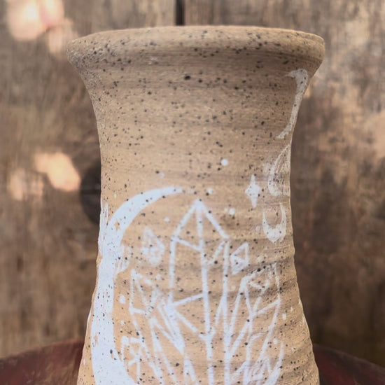 Perfect accent for your restorative and meditative activities. This raw clay exterior is accented with moon-themed beauty, like moths and crystals floating in a crescent. The inside is glazed with a matte satin so that it can be used as a vase or oil diffuser.
