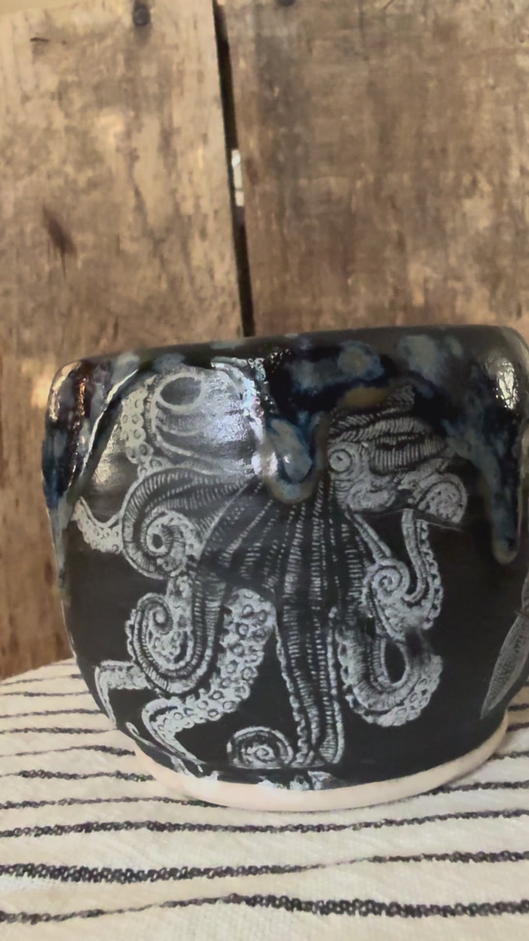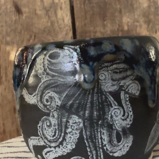 Step into the mystery of the sea with the Inky Depths Mug. A matte black exterior stamped with a white cephalopod design evokes the shadows of the ocean floor, while the blue fluxing glaze against the teal inside glows like hidden waters. The speckled iridescent drip shimmers softly, catching the light like moonlit waves.