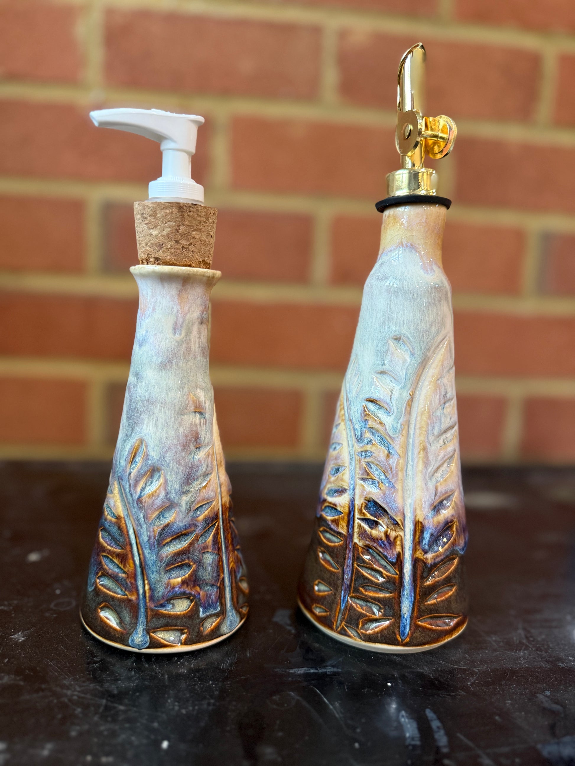 This hand-carved bottle, etched with leaf designs and glazed in shifting dual tones with a subtle iridescent sheen — feels alive in the light. Use as a diffuser bottle or top with pump: it’s perfect for soap, lotion, or something uniquely yours. Beauty belongs at every sink, in every touch.
