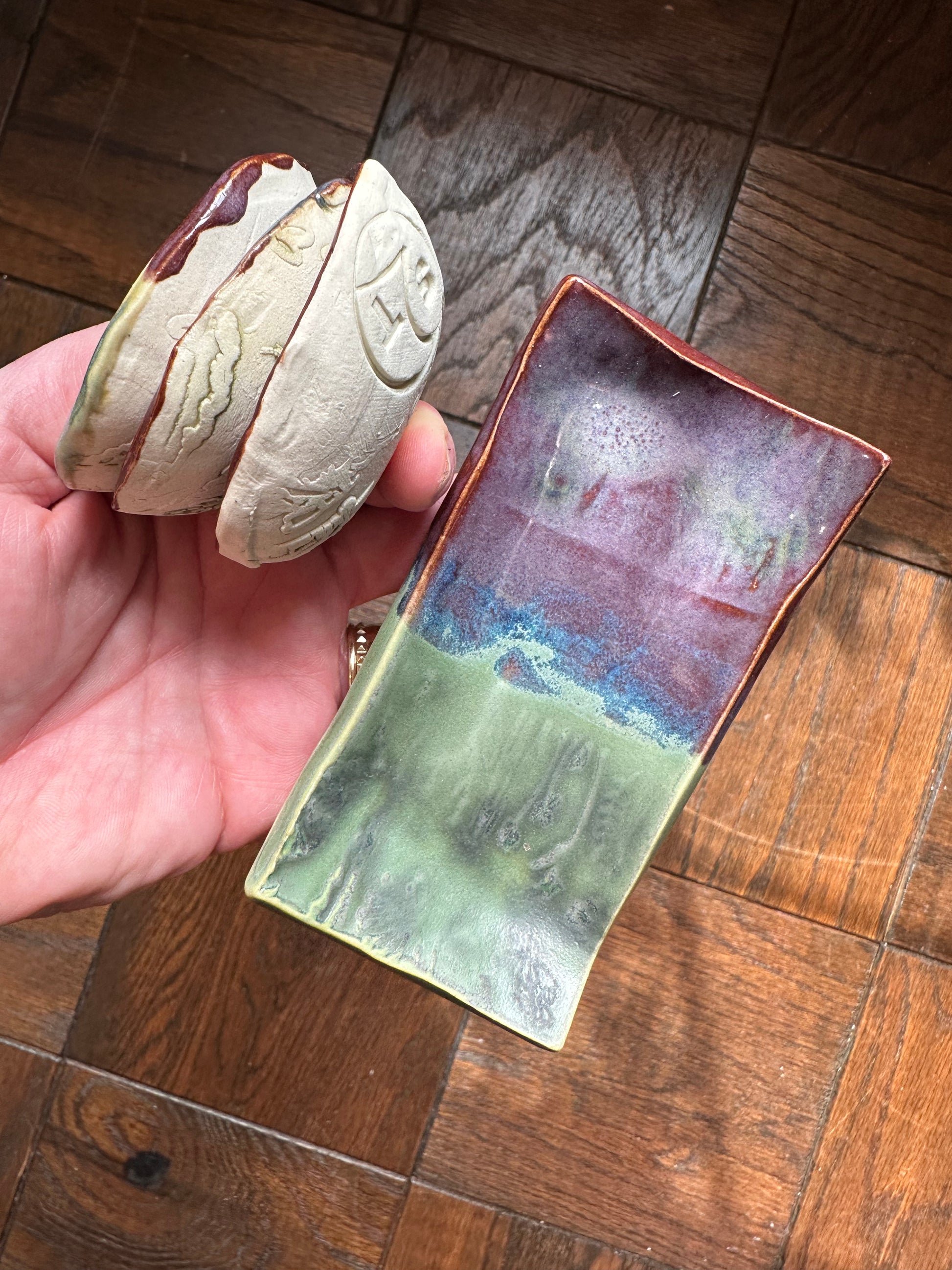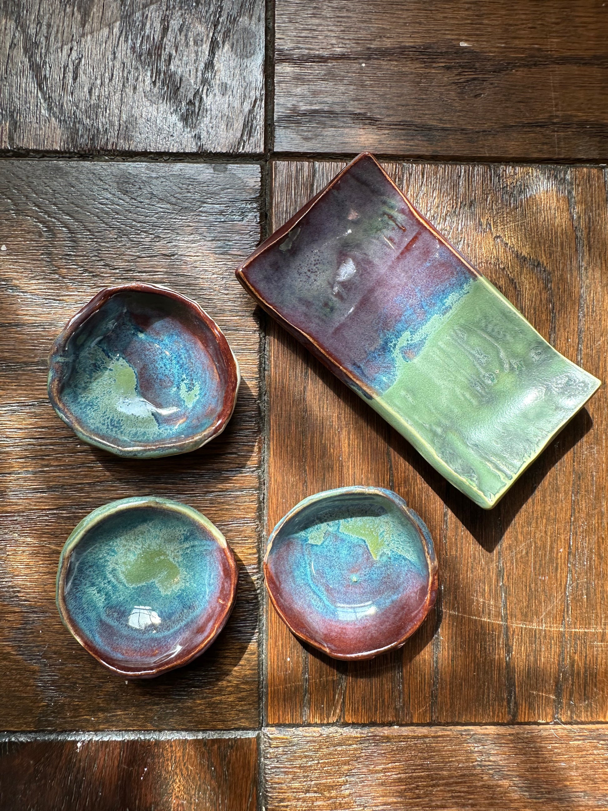 This 4-piece set includes 3 catch-all dishes for your dips, mise en place, jewelry, etc. As well as one angled plate, which could be used for sushi or your kitchen sponge. The possibilities are endless! The colors are a soothing green tea and smoky merlot, fused to a stunning reflective blue.