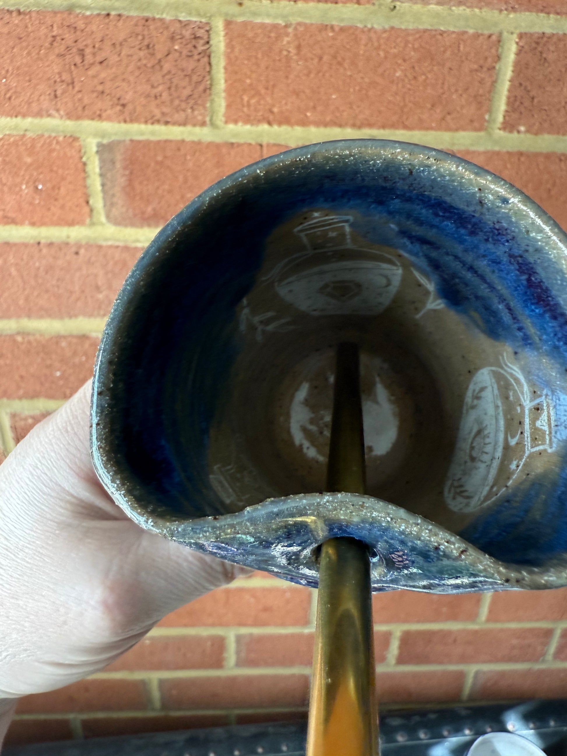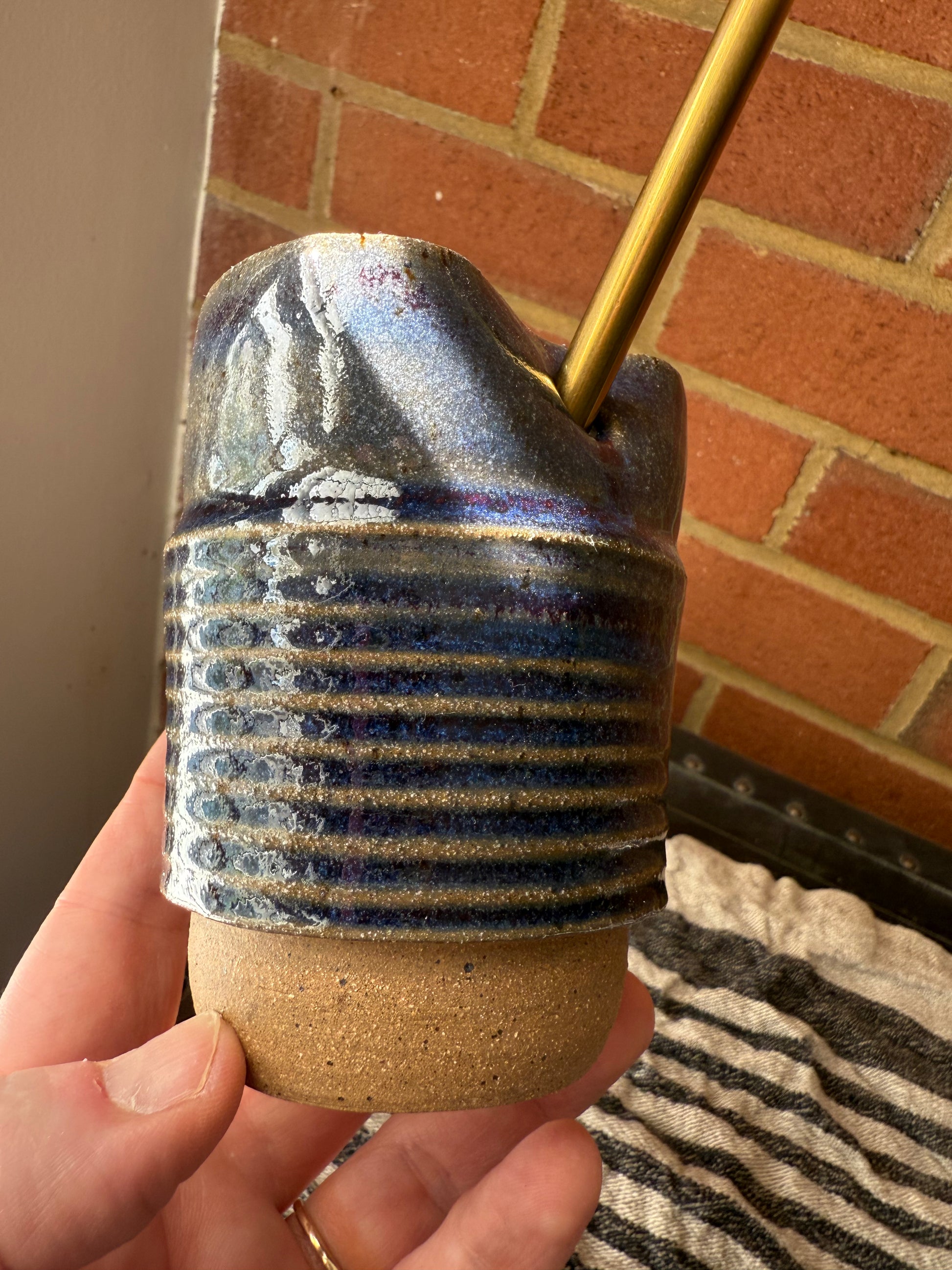 This straw tumbler has a raw clay base, horizontal ribbed texture, and finished in an opaque blue glaze kissed with metallic shimmer. A built-in straw opening at the rim (metal straw included) makes it functional, but the design? Well, that’s just a little extra fun.