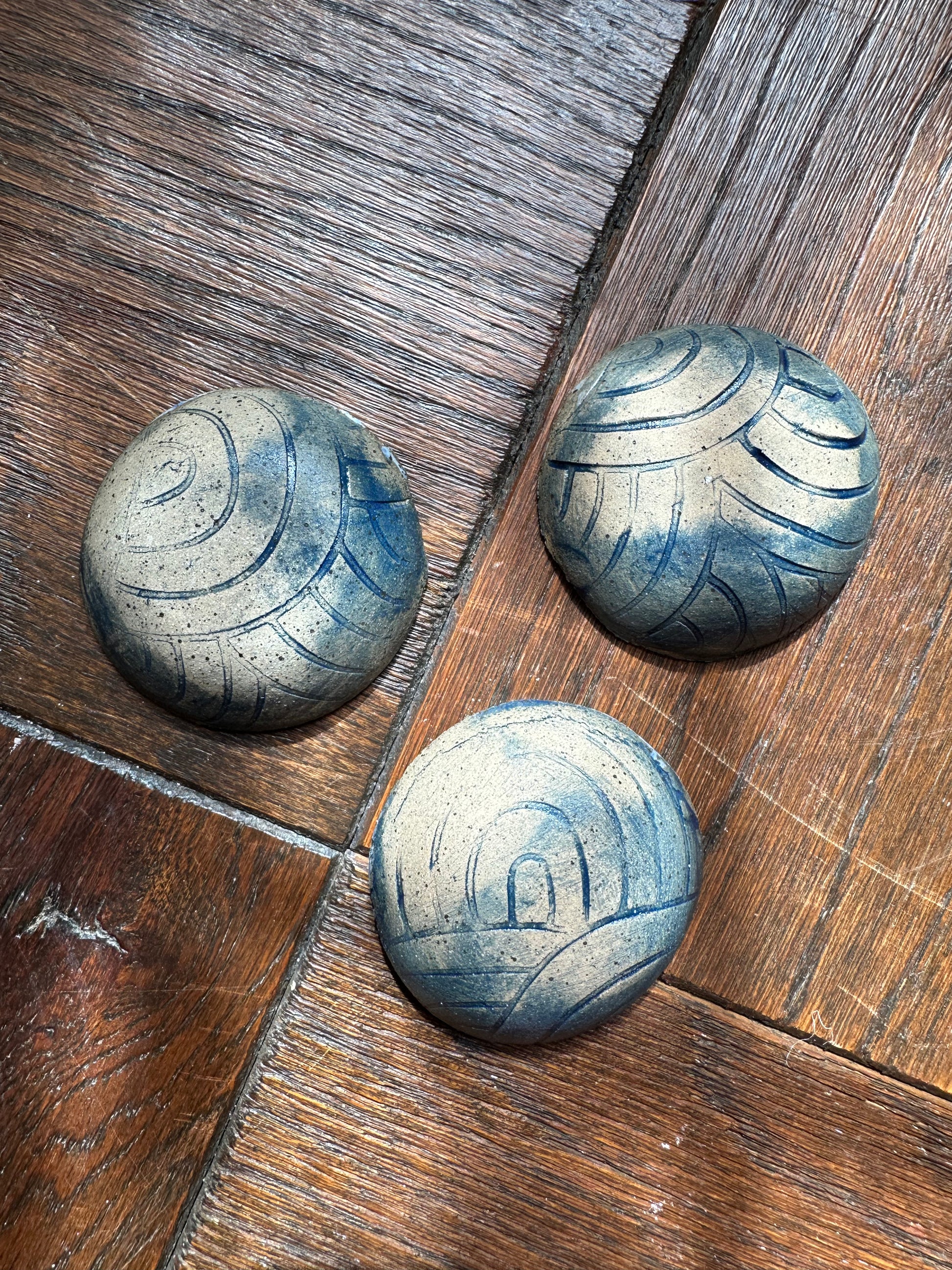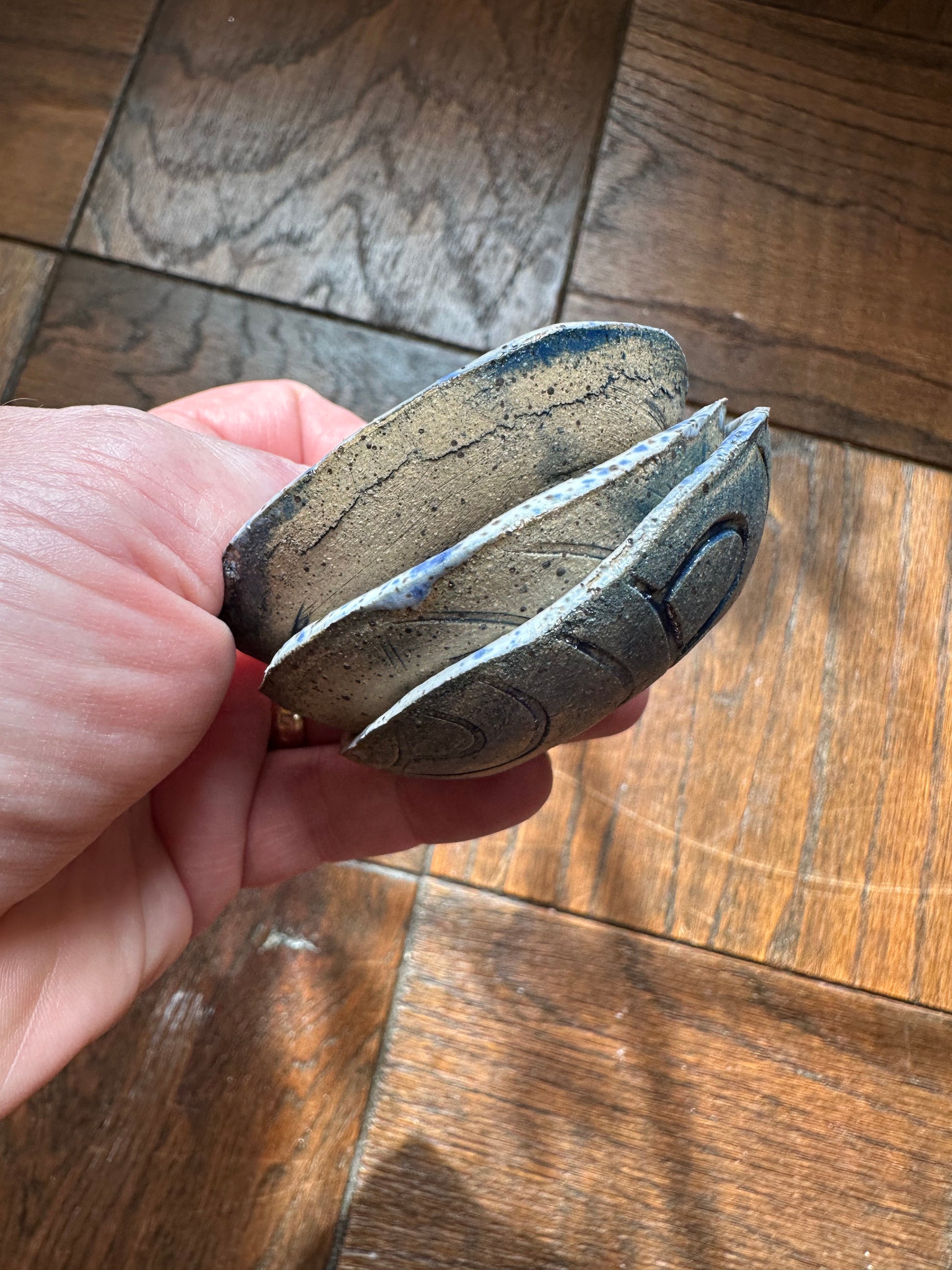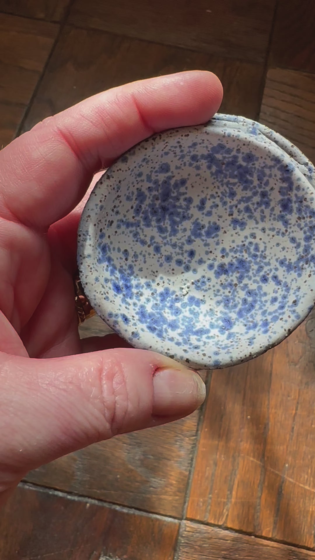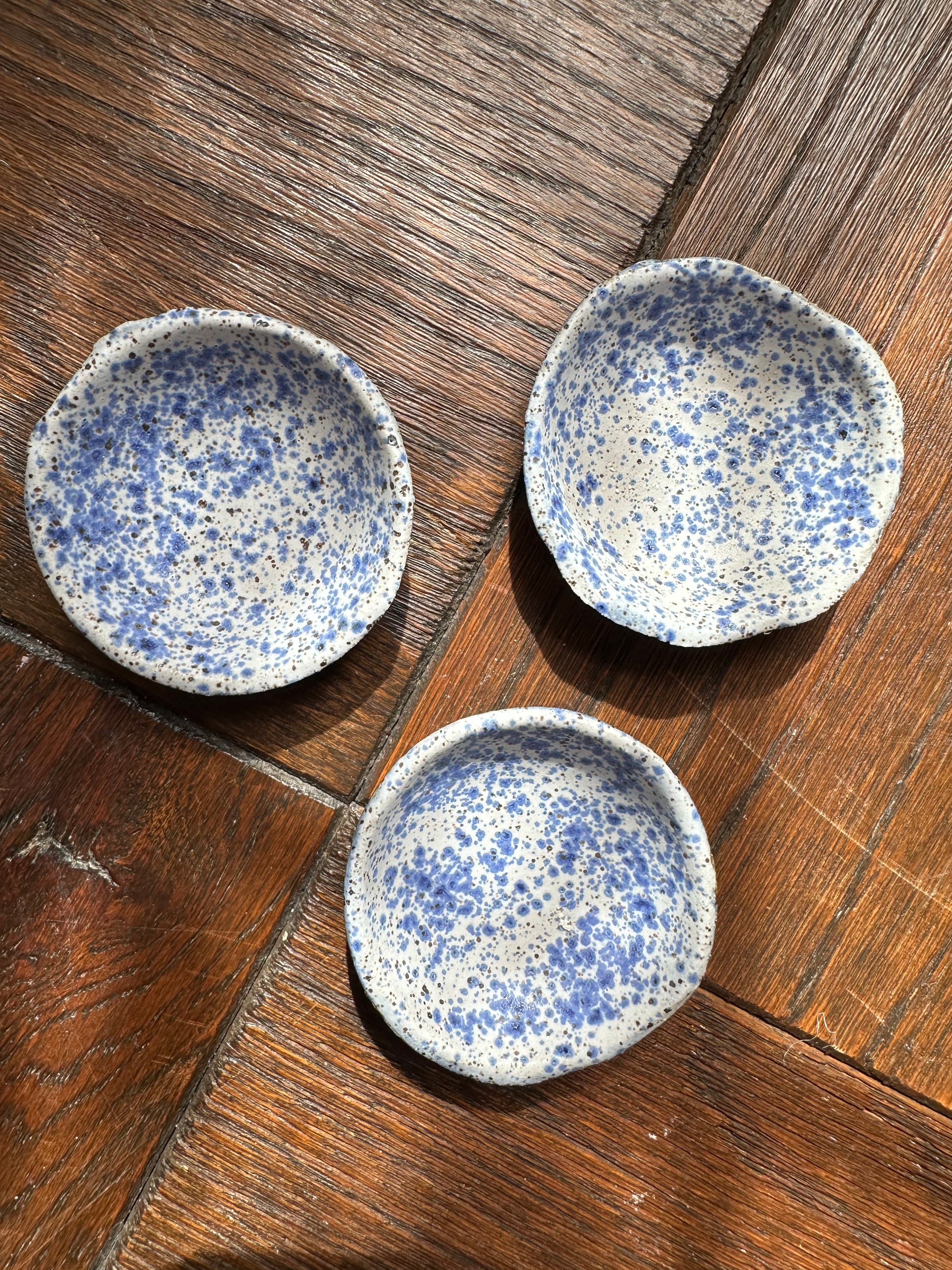 Three little catch-all dishes for all your needs! Perfect for your dips, mise en place, jewelry, or supplements. The interior of the bowl features a white matte glaze speckled with a lapis blue splatter while the exterior has a cobalt wash to highlight the rainbow cloud swirls on beige speckled clay.