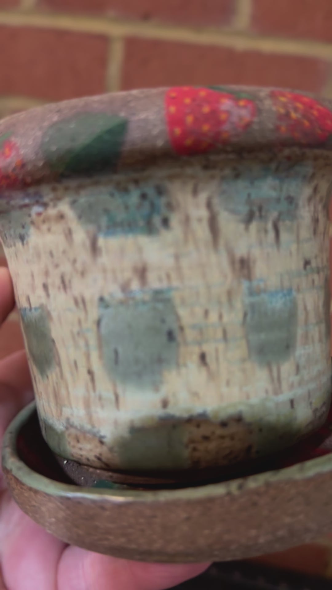 Dimensions & details coming soon. Perfect for growing your strawbabies! This picnic-inspired planter is green and beige check with strawberry accents on the rim and catch plate. Planter has drainage holes and is unglazed interior ideal for houseplants. Toasted brown speckled clay.